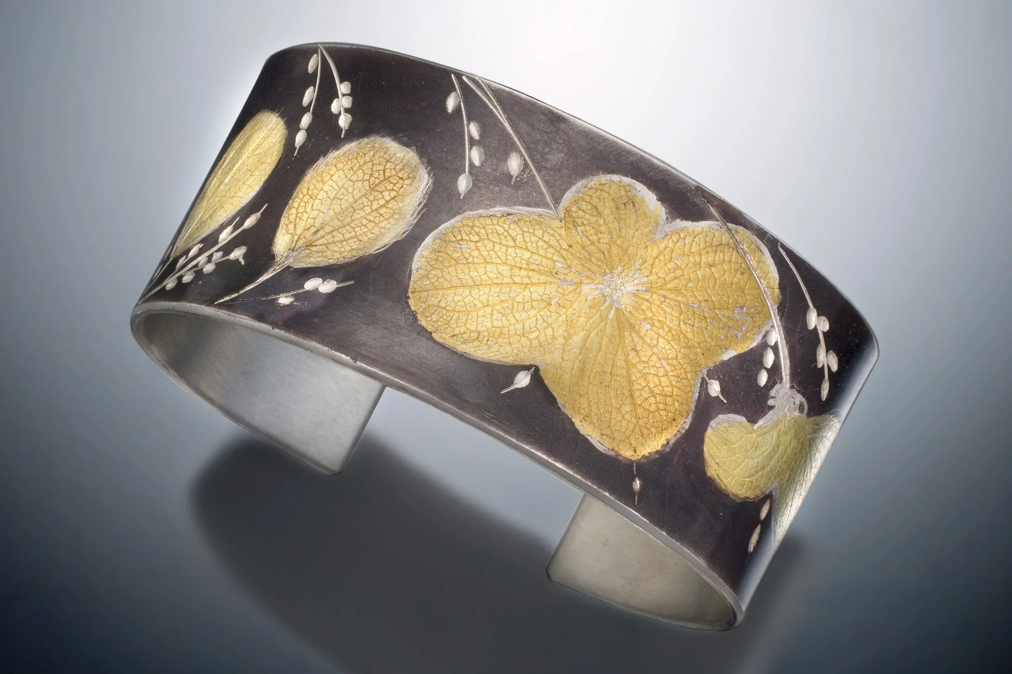 For my Botanical Collection, I use dried leaves and flowers from my garden. I roller press them into fine silver. I then apply a thin layer of 24k gold using the ancient Asian technique of Keum-boo. I engrave and burnish the gold to bring out the fine detail.